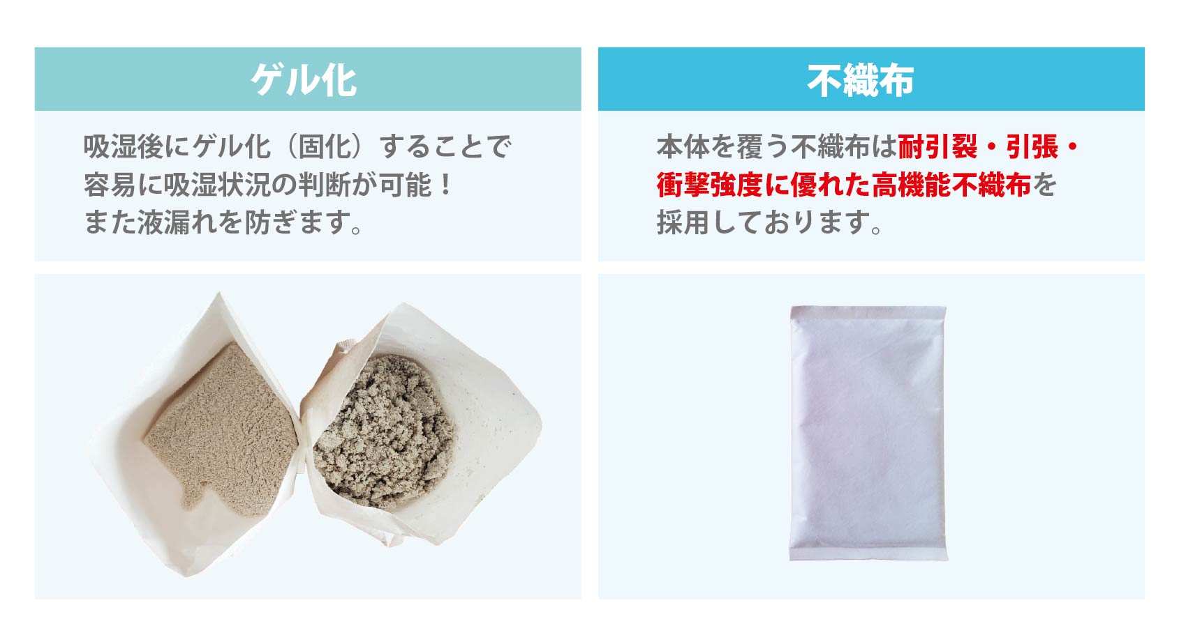 吸湿後はゲル化(固化)により、容易に吸湿状況の判断が可能。また水を通さず高い透湿性を持つ高機能不織布を使用することで製品の液漏れを防ぎます。