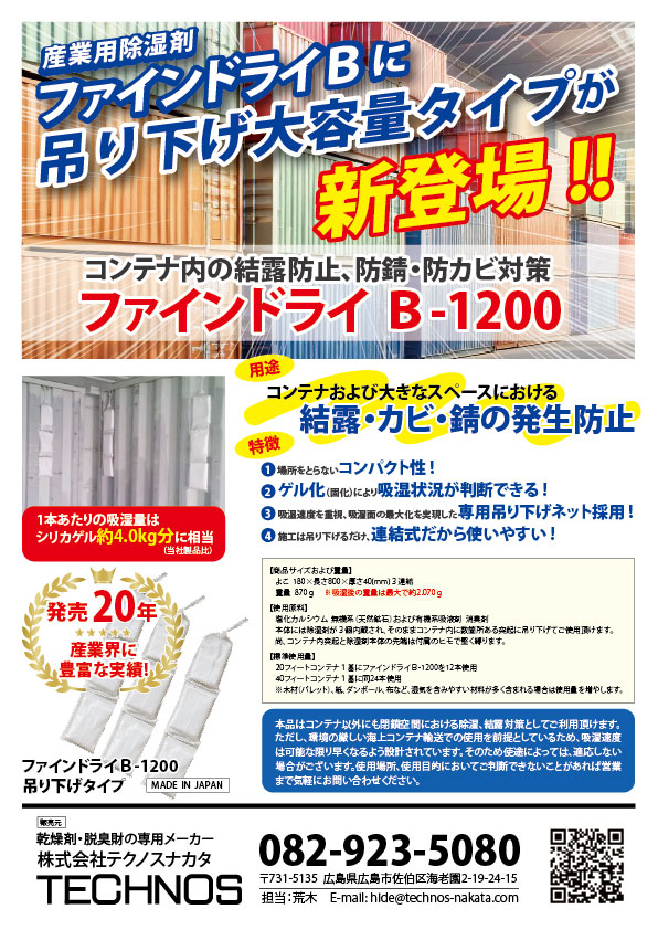 ●輸送・保管期間が長期になる可能性とか、コンテナ内に湿気を含みやすい材料が多く詰みこまれる場合は適宜、使用量を増やします。