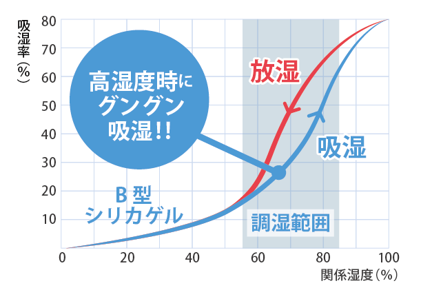 | 結露防止 | 湿度が上昇するほど吸湿効果が高くなり、結露の発生を抑制 | 左に同じ |